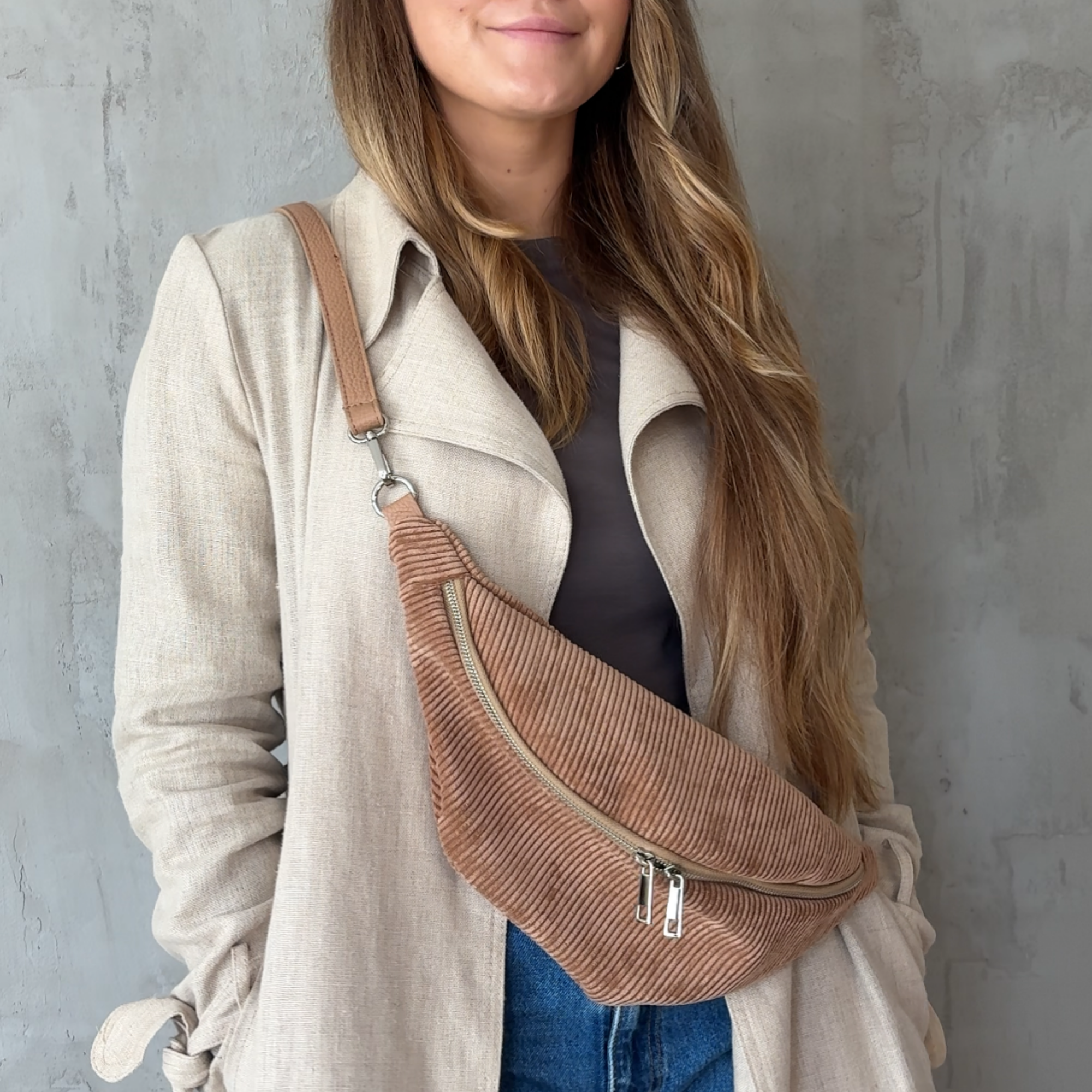 nsere Bauchtaschen aus hochwertigem Cord vereinen lässigen Stil mit praktischer Funktion. Das weiche, strukturierte Material verleiht der Tasche einen modernen, zugleich gemütlichen Look. Dezente Lederdetails setzen edle Akzente und sorgen für zusätzliche Stabilität. Der Reißverschluss läuft angenehm weich und schließt zuverlässig – ideal für unterwegs. Dank stabiler Ösen lässt sich der Taschengurt ganz einfach austauschen, sodass du deine Tasche jederzeit mit einem unserer vielen Gurtdesigns individuell gestalten kannst. Im Inneren bietet ein zusätzliches Fach Platz für Kleinigkeiten, die du schnell zur Hand haben möchtest.