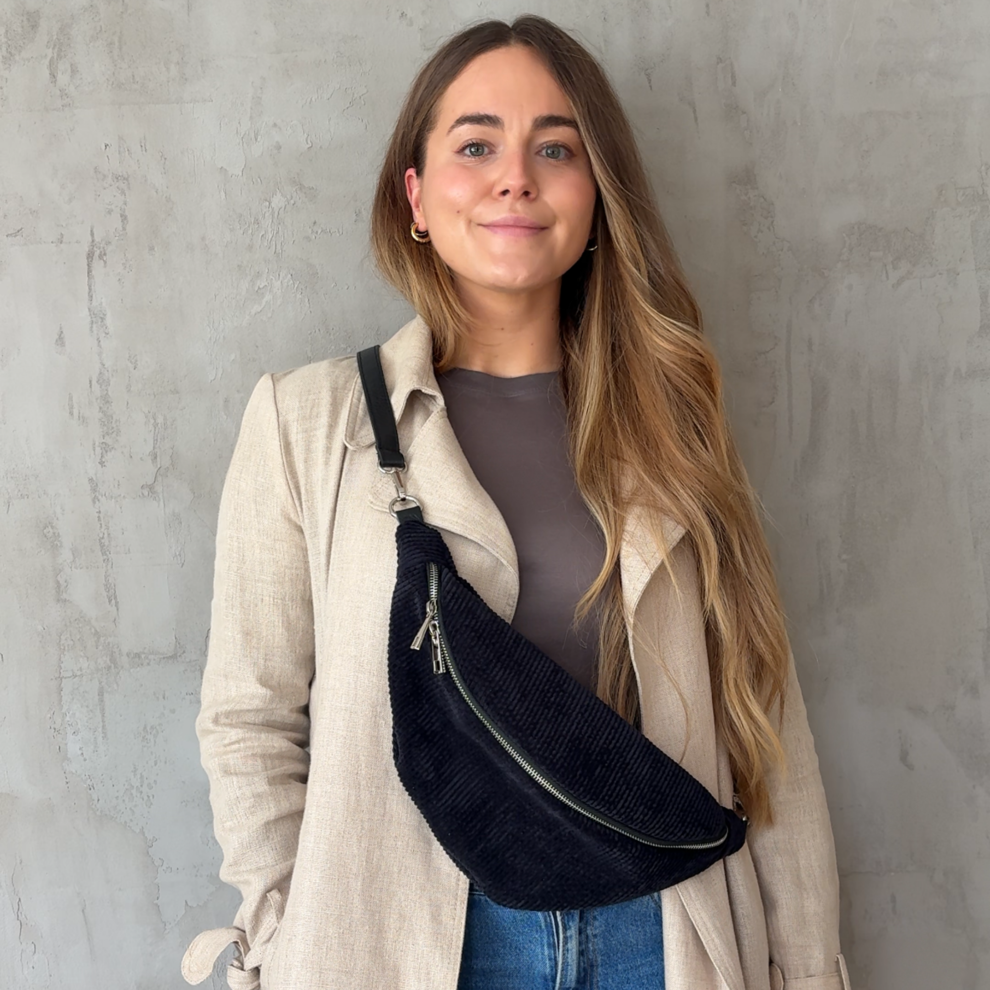 IDA ist eine große Bauchtasche aus weichem Cord – lässig, robust und angenehm zu tragen. Die Ösen sind mit Leder hinterlegt, was ihr nicht nur Stabilität, sondern auch eine feine handwerkliche Note verleiht.