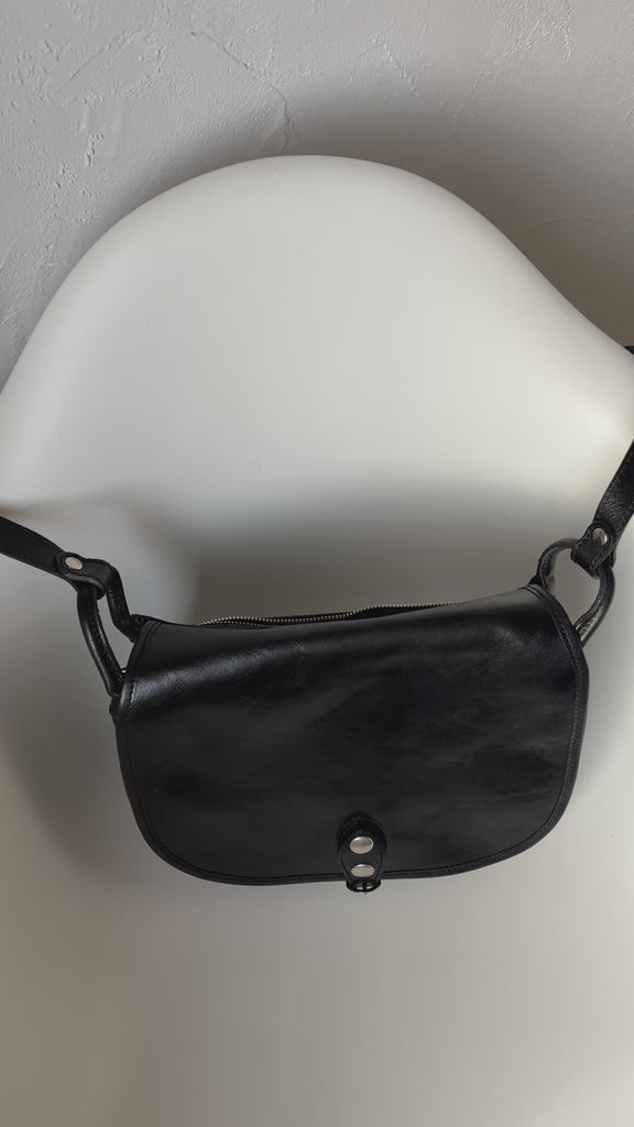 This beautiful leather shoulder bag in vintage style has a flap that can be closed with a button closure, which conceals the two inner compartments. On the back of the bag there is an additional closable compartment and the shoulder strap is adjustable. You can easily store your wallet, cell phone, a small bunch of keys and other small items. LEANDRA is timelessly beautiful and is able to upgrade any of your outfits.