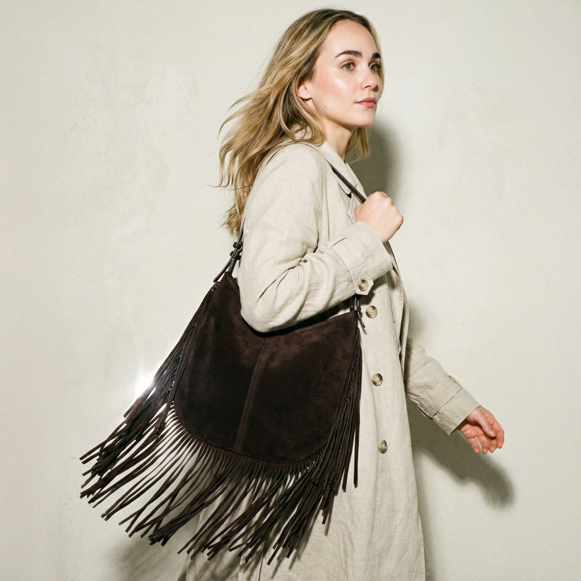 Unsere Fransentasche MONTANA ist ein echtes Statement-Piece mit unverwechselbarem Charakter. Gefertigt aus hochwertigem Wildleder, begeistert sie mit einer besonders weichen Haptik und einer natürlichen Struktur, die mit der Zeit eine wunderschöne Patina entwickelt. Das Highlight von MONTANA sind die langen, feinen Fransen, die bei jeder Bewegung lebendig mitschwingen und der Tasche eine besondere Dynamik verleihen. Ob beim Gehen durch die Stadt oder auf dem Weg zum nächsten Event – die Fransen tanzen leicht im Rhythmus deiner Schritte und machen jeden Look zum Blickfang. So vereint MONTANA lässigen Boho-Charme mit hochwertiger Verarbeitung und wird zu deinem ausdrucksstarken Begleiter für besondere Momente.