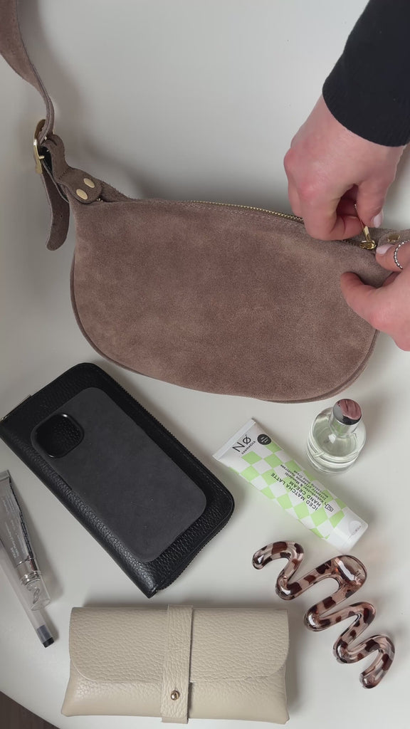 Unsere MINA ist eine hochwertige Wildleder-Umhängetasche für Damen, die Eleganz und Funktionalität perfekt vereint. Gefertigt aus feinem Wildleder, besticht sie durch ihre edle Optik und die goldfarbenen Details, inklusive eines stilvollen goldenen Reißverschlusses, die jedem Outfit einen luxuriösen Akzent verleihen.
