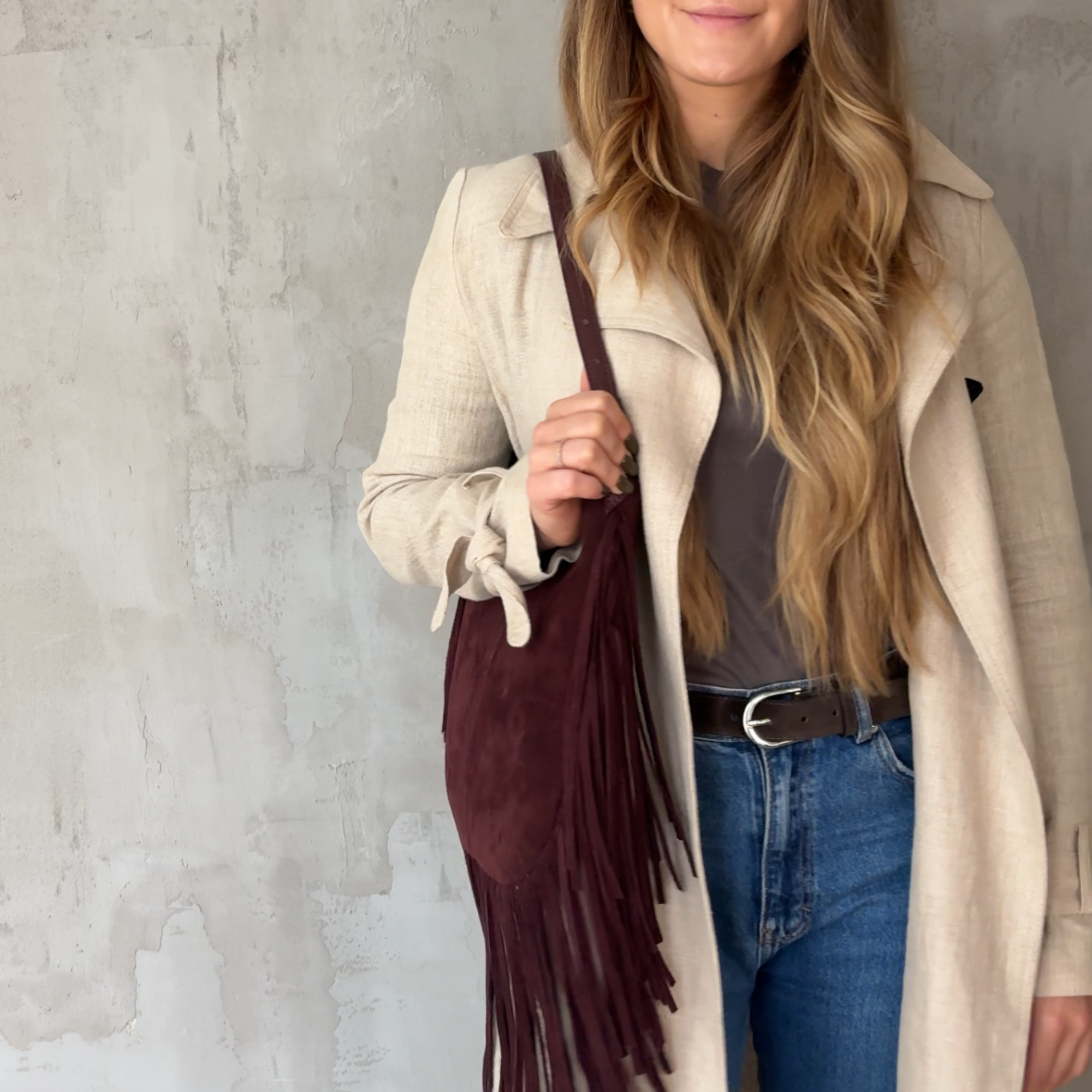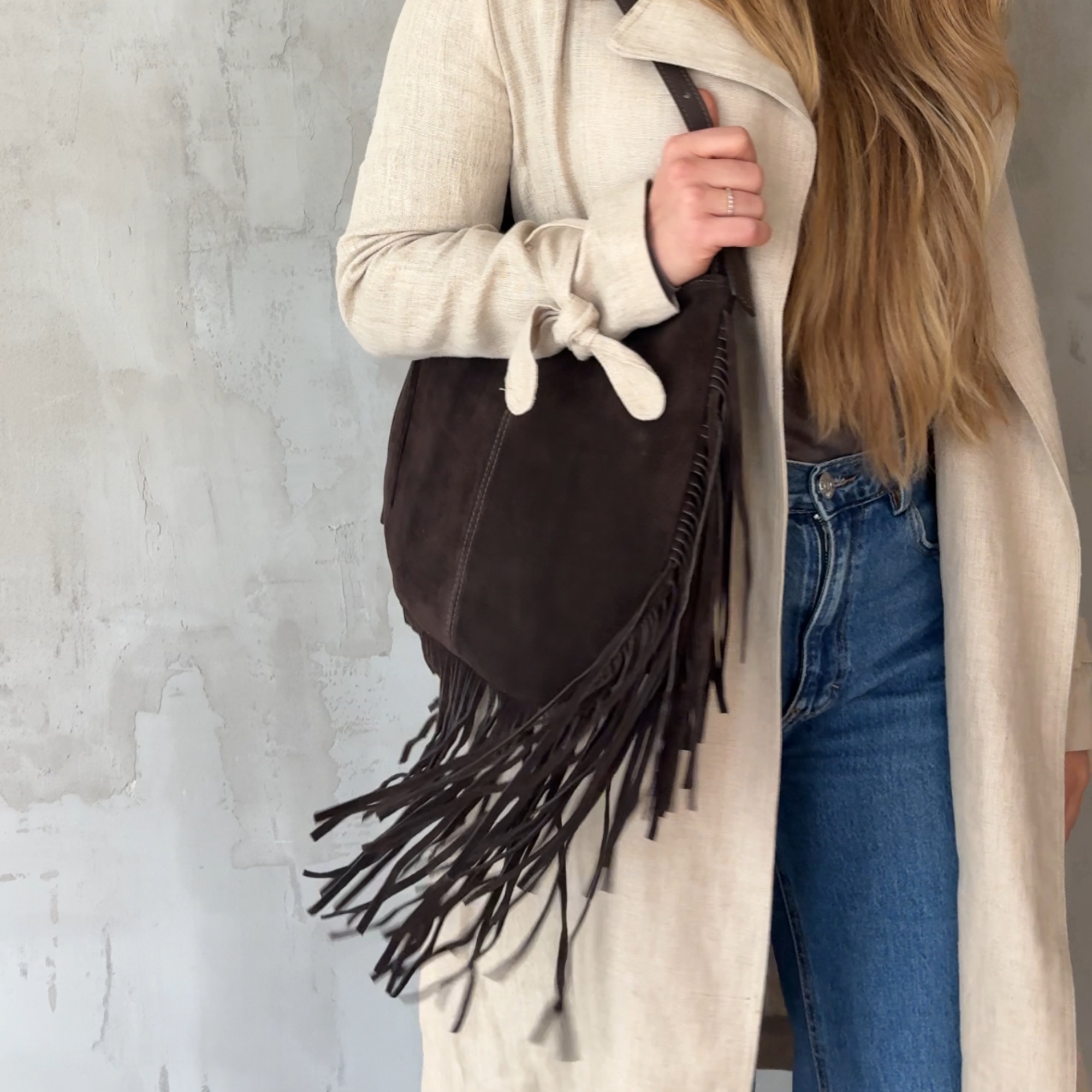 Unsere MONTANA ist eine stilvolle Wildleder Umhängetasche für Damen, die mit ihrem lässigen Boho-Charme und hochwertigen Materialien begeistert. Gefertigt aus softem Wildleder, besticht sie durch ihre weiche Haptik und die markanten Fransen, die jedem Look eine feminine und zugleich entspannte Note verleihen.